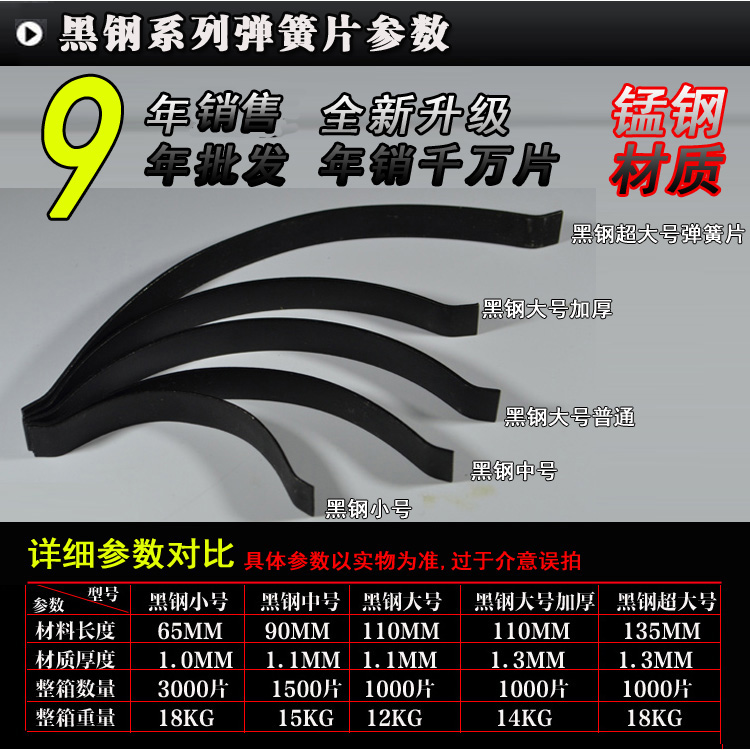 Black steel small spring plate 50 pieces black steel medium spring plate 50 pieces black steel large ordinary spring plate 50 pieces black steel large thickened spring plate 50 pieces black steel oversized spring plate 50 pieces black steel small spring plate 200 pieces black steel medium spring plate 200 pieces black steel large ordinary spring plate 200 pieces black steel large thick spring plate 200 pieces black steel large spring plate 150 pieces black steel small spring piece a box 3000 pieces black steel medium spring piece a box 1500 pieces black steel large ordinary one box 1000 pieces black steel large thickened a box 1000 pieces black steel super shrapnel a box 1000 pieces