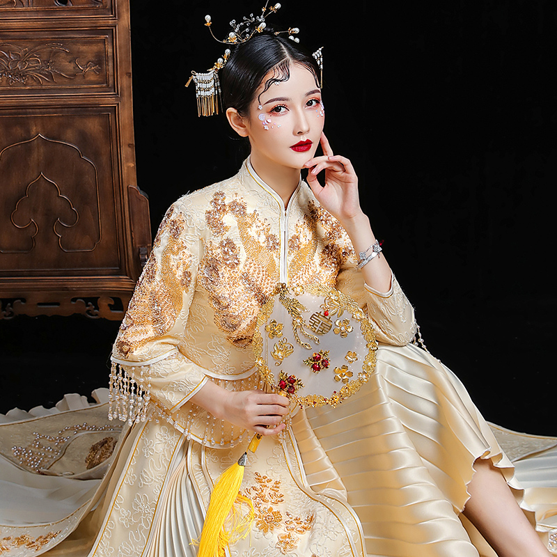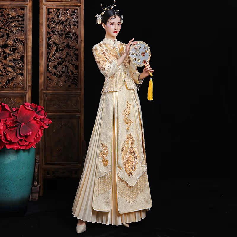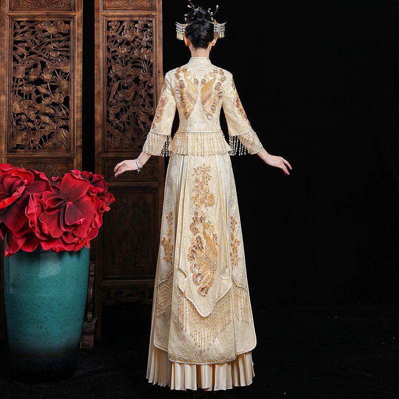 Champagne color Xiuhe dress 2021 new wedding dress Chinese bridal dress Xiuhe female slim-fit dragon and phoenix hanging out cabinet dress