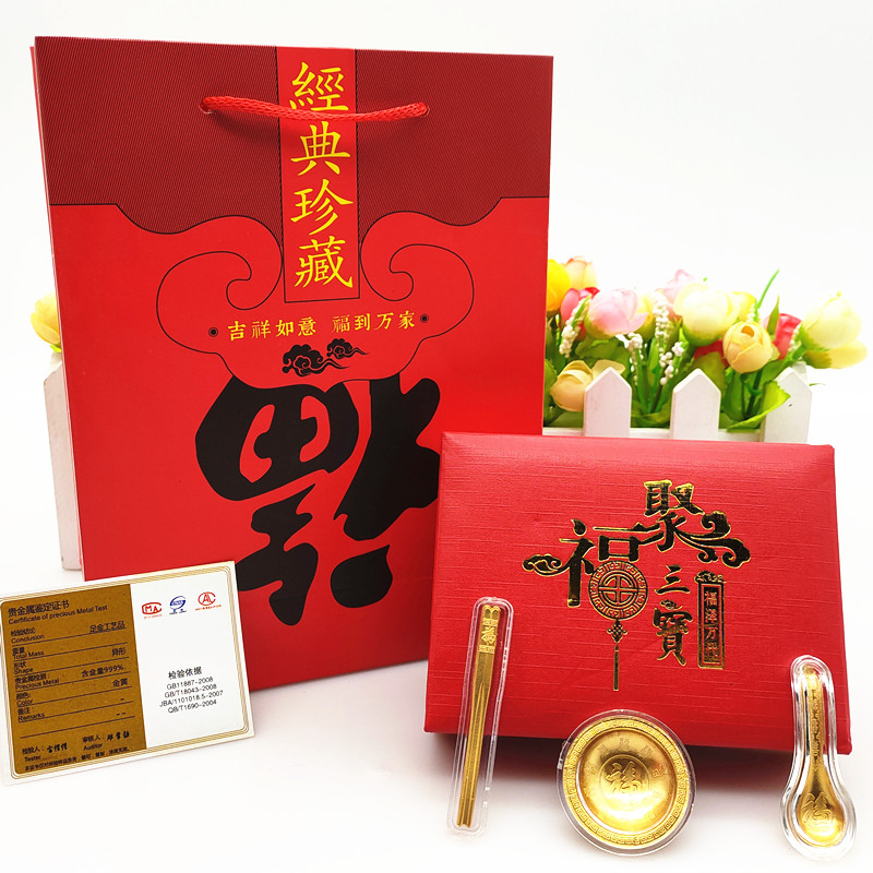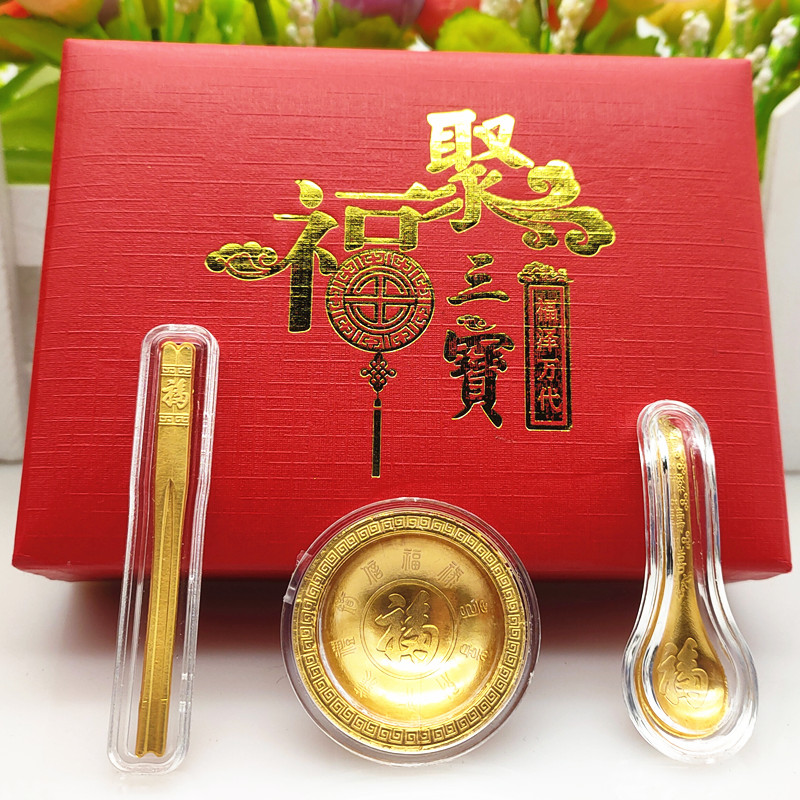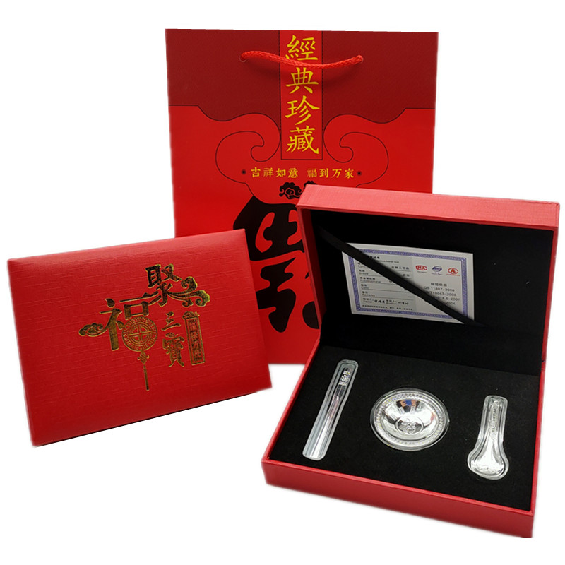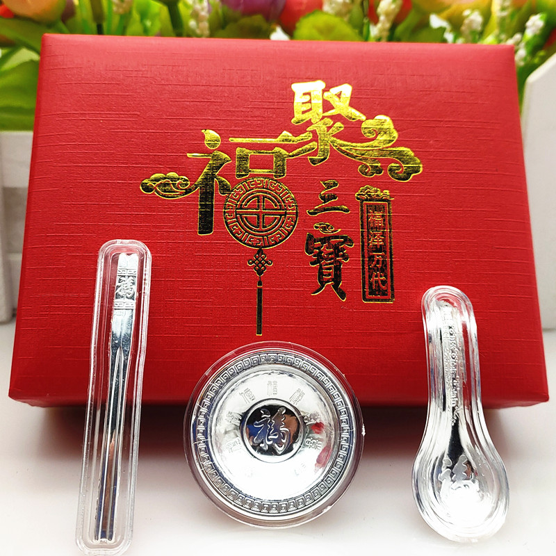 Foot Silver Jufu Three Treasures Silver Bowls and Chopsticks Spoon Three-piece Gold Foil Gift Ornament Bancassurance Sales Event Gift