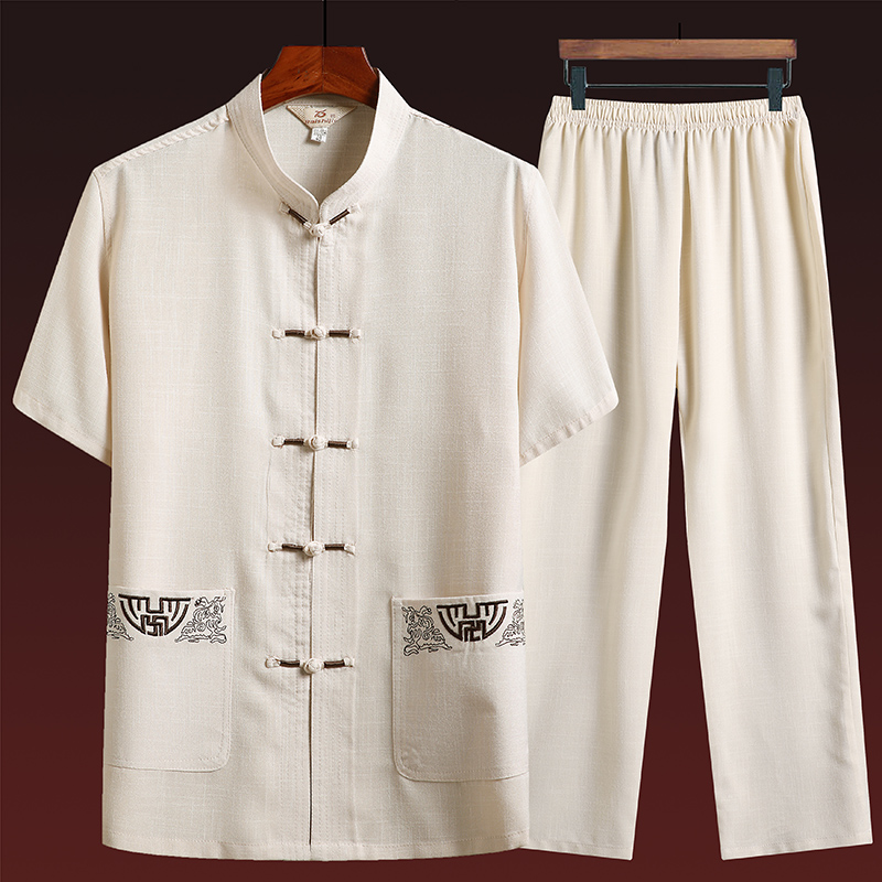 Summer Short Sleeve Tang Dress Mid-Aged Cotton Hemp Casual Two-piece Style Chinese Wind Men's Dad Costume Grandpa Hanfu