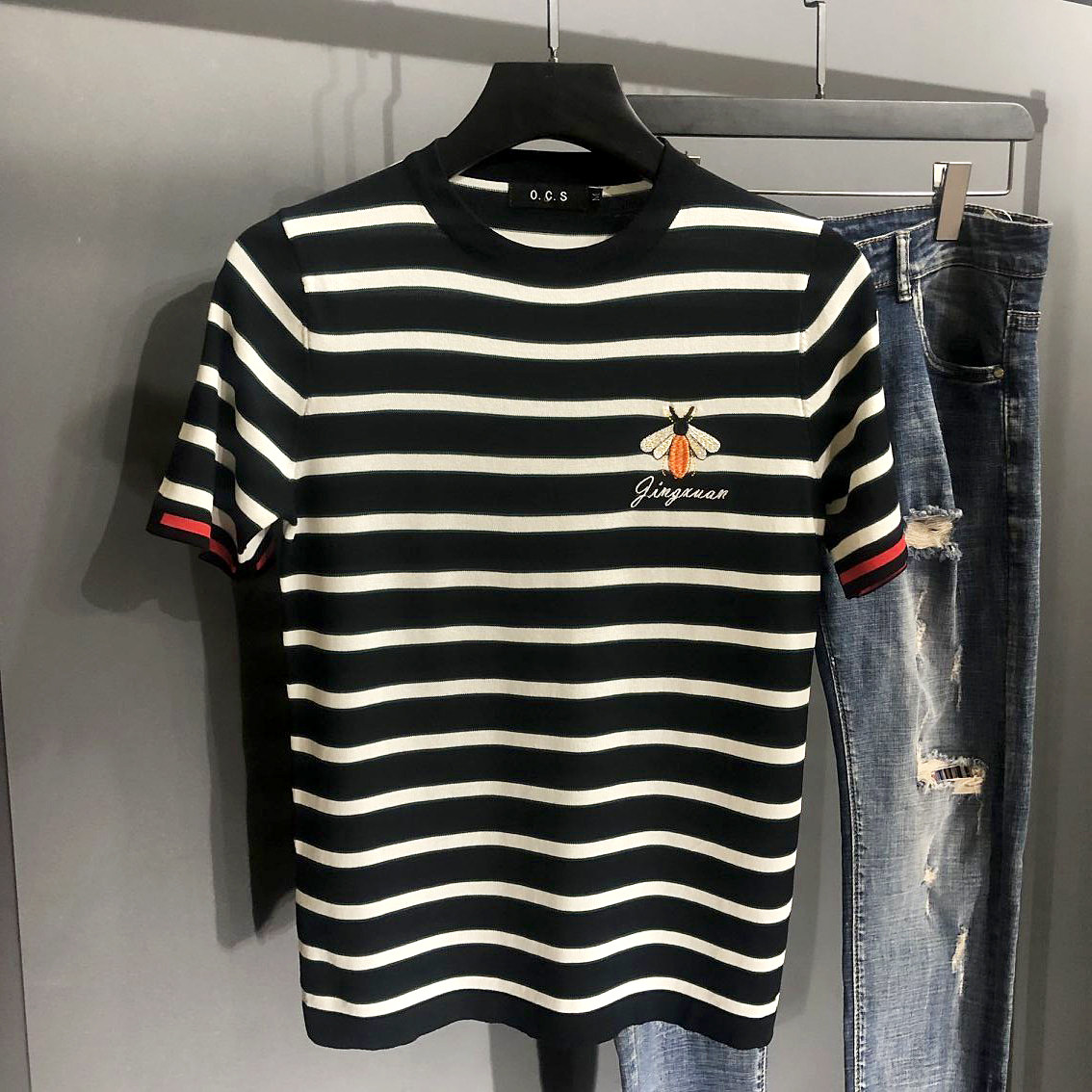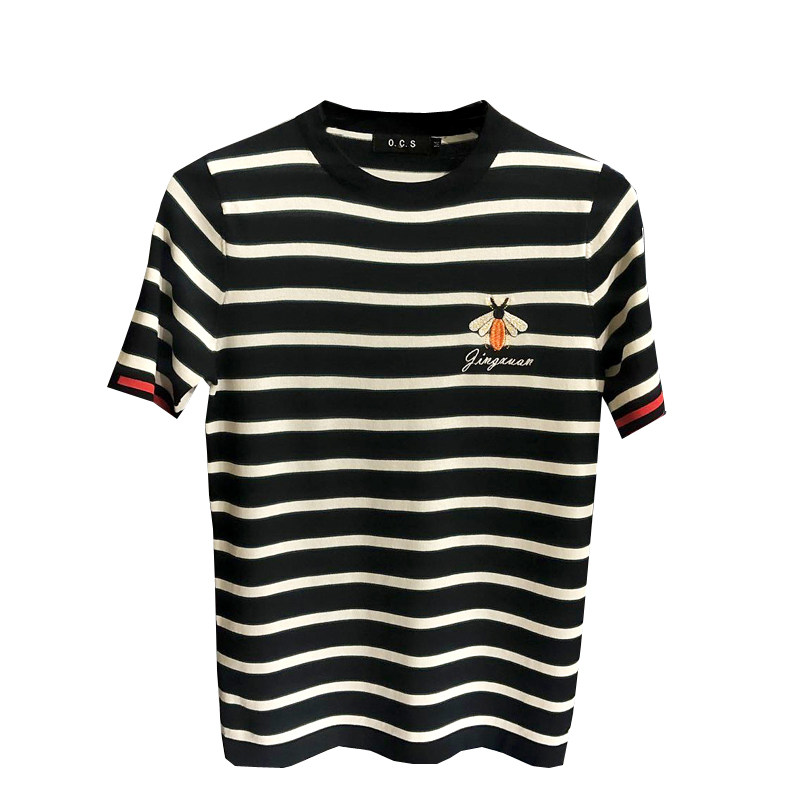 2021 Summer European station Short sleeves T-shirt Male Little Bee T-shirt Ice Thin Embroidered Male black and white striped