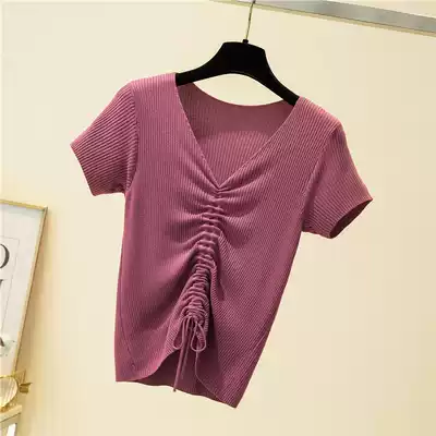 Summer 2021 New V-neck ice silk knit sweater women's short sleeve foreign pie base short sleeve drawstring top T-shirt ins tide