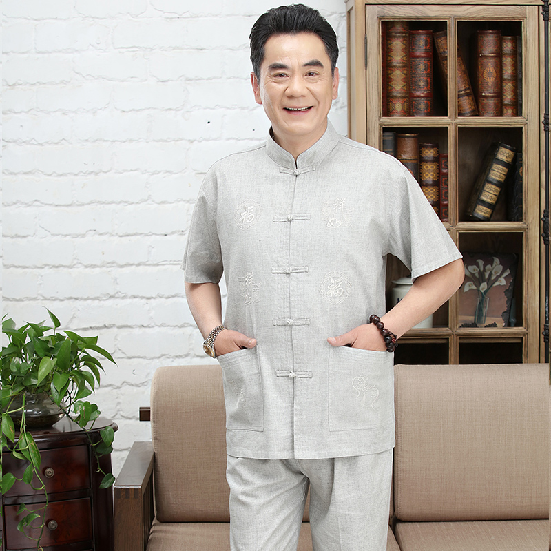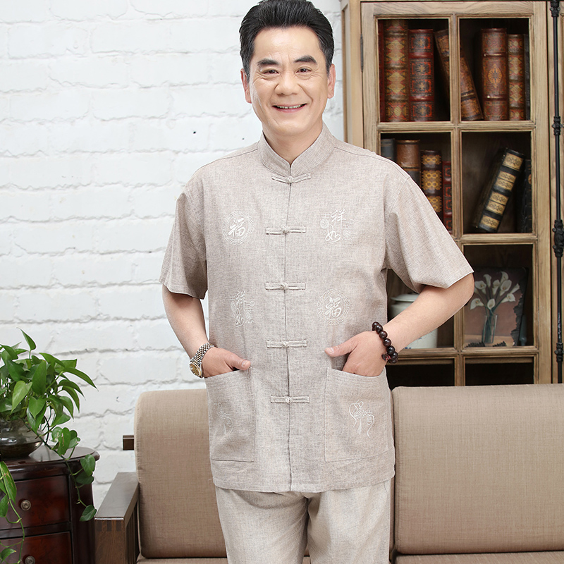 Linen Tang Dress Man Short Sleeve Suit Dad Summer Clothing Chinese Pan Button Embroidered Shirt Chinese Wind Grandpa Summer Clothes