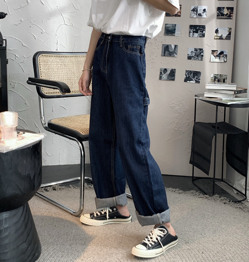 Mr short sentence dark blue jeans men's 2021 straight tube loose Korean version of the trend mopping wide leg casual trousers