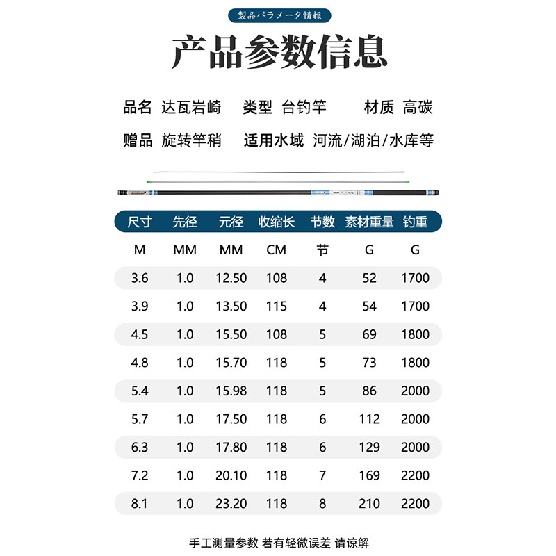 Ultra-light 3.6 meters (57 grams) + original rod slightly ultra-light 3.9 meters (59 grams) + original rod slightly ultra-light 4.5 meters (76 grams) + original rod slightly ultra-light 4.8 meters (80 grams) + original pole slightly ultralight 5.4 meters (97 grams) + original rod slightly ultralight 5.7 meters (128 grams) + original rod slightly ultralight 6.3 meters (136 grams) + original rod slightly ultralight 7.2 meters (175 grams) + original pole slightly lighter 8.1 meters (218 grams) + original rod slightly lighter