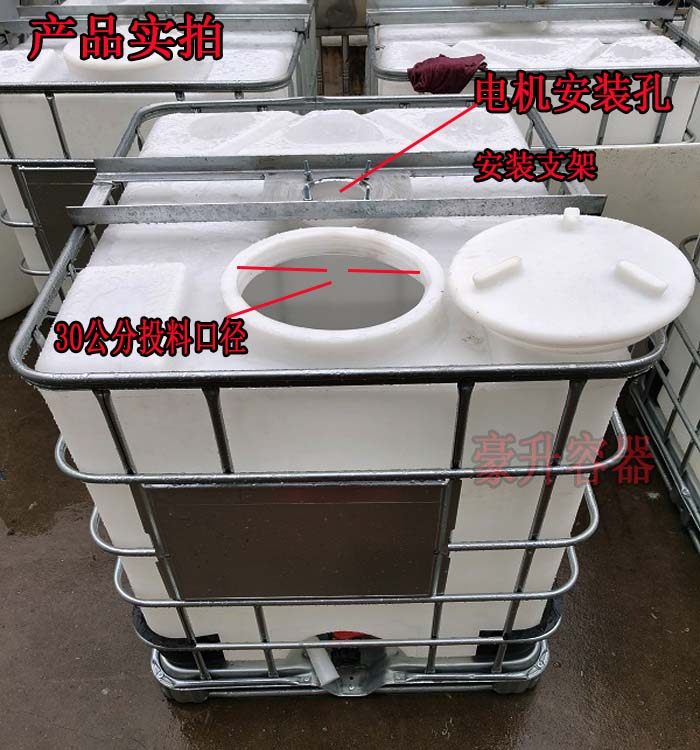 Tons barrel mixer converted to add motor bracket square barrel Chemical dosing tank Stir Tank Chemical Ton barrel 1 ton pile high machine barrel