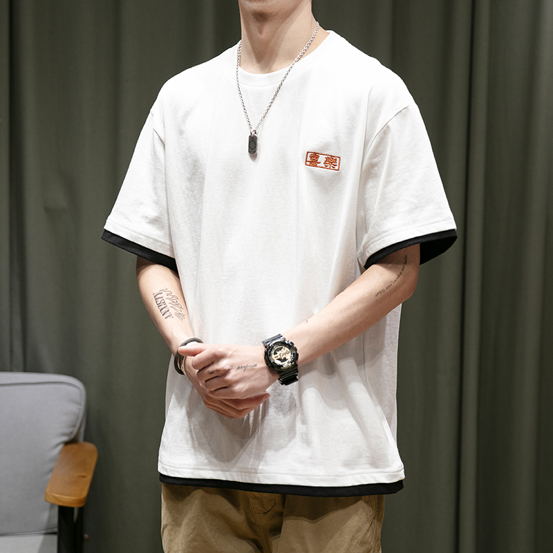 Day Series Tide Cards Summer New Fake Two Embroideries Men's Trend Loose Round Collar Inner-Lovers Loose Half Sleeves