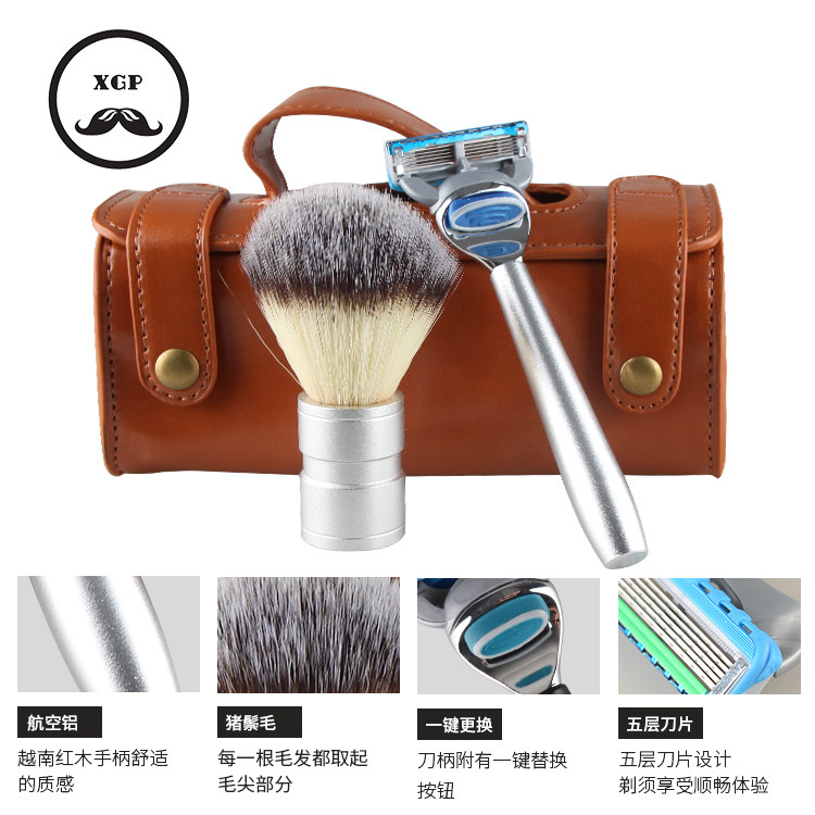 Men's Travel Razor Manual Razor Leather Bag Vintage Retro Razor Aviation Aluminum Handle with Beard Brush