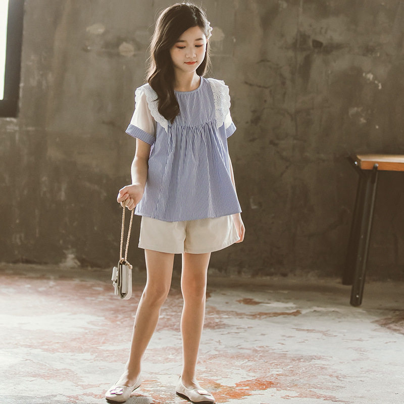 2022 Summer Dress New Girl Short Sleeve Loose Splicing Lace Doll Shirt Girl Foreign Striped Princess Blouse