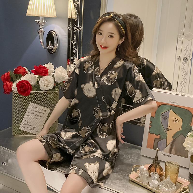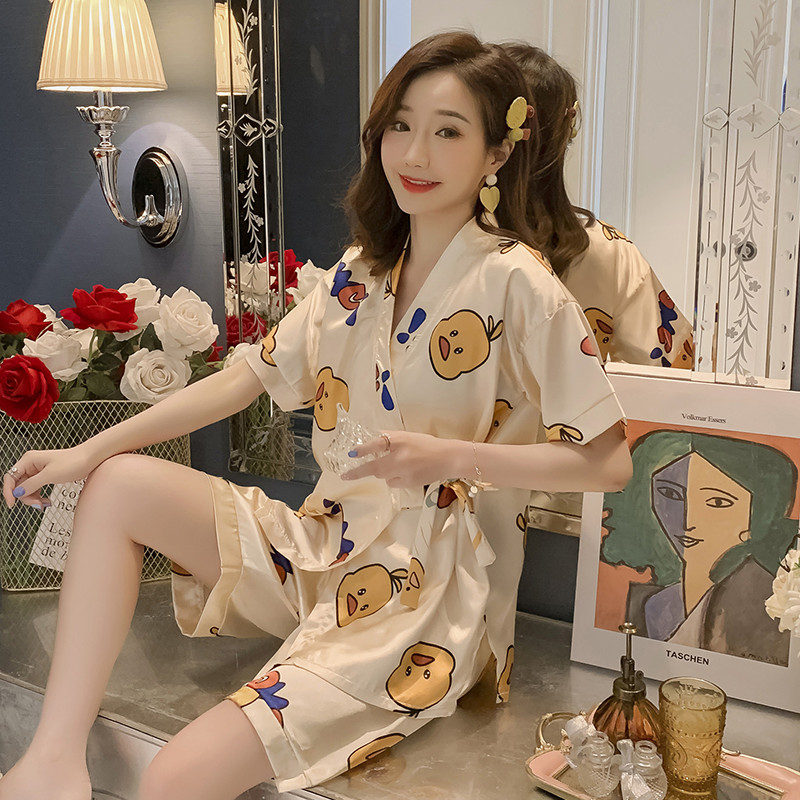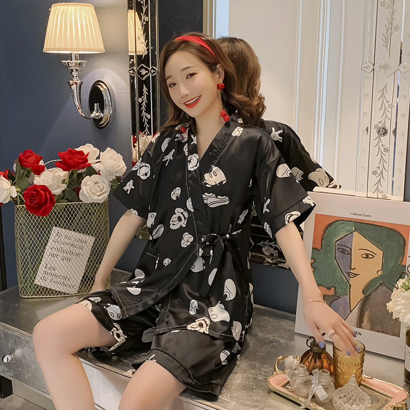 Japanese pajamas women's summer short-sleeved ice silk kimono Japanese girls Silk Loose home clothes two-piece set summer