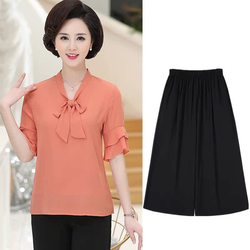 Mother's Day mom summer two-piece fashion 40-50 years old short-sleeved t-shirt top middle-aged women suit Chiffon shirt