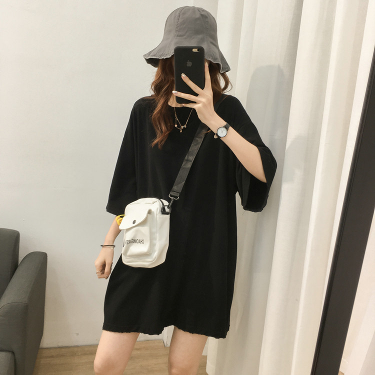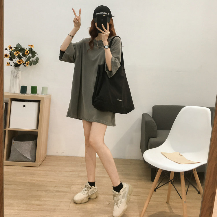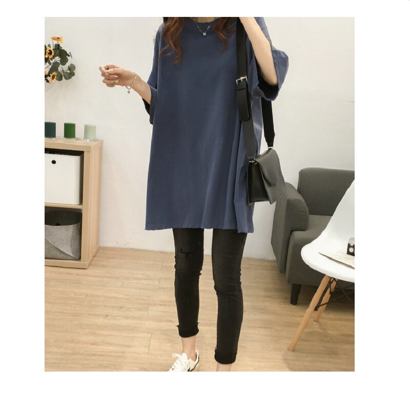 South Korean spring and summer medium long version of round collar short sleeve T-shirt female pure cotton large size Korean version loose and thin casual dines blouses