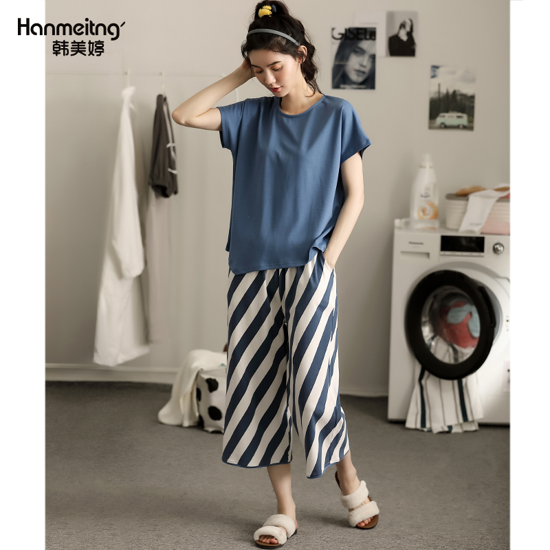 Pajamas women's summer cotton thin short-sleeved three-point pants Spring and summer home clothes Summer loose large size trousers two-piece suit