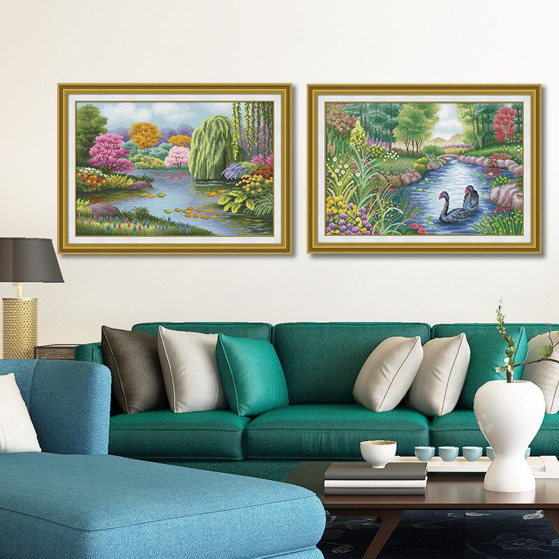 KS Cross Embroidered Spring Huaqiu Real Living Room Bedroom Quadrulian Landscape Wind Landscape Painting 2020 New Line Embroidered Self-Embroidered
