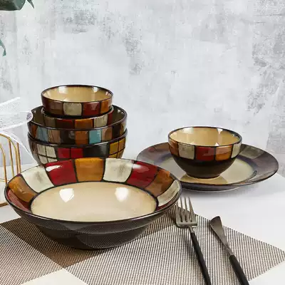 Yuquan retro rice bowl for eating a single household bowl plate noodle bowl Japanese and Korean ceramic color checkered tableware thickened