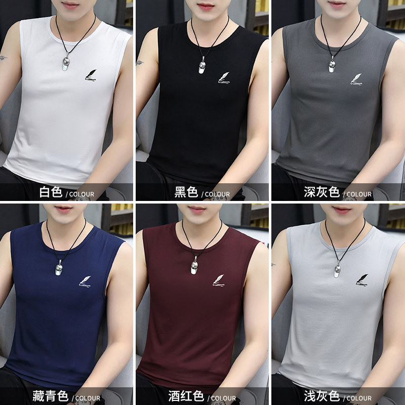 2 Pieces) Modale Round Collar Men's Vest Pure Cotton Summer Ice Silk Breathable Fitness Tight Without Sleeveless Wide Kampo Shoulder Tide