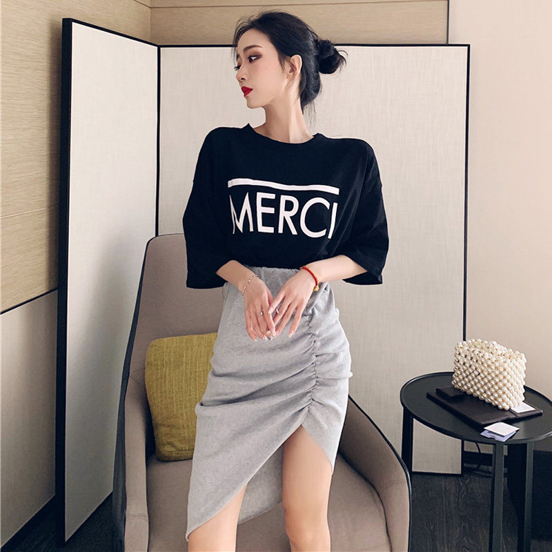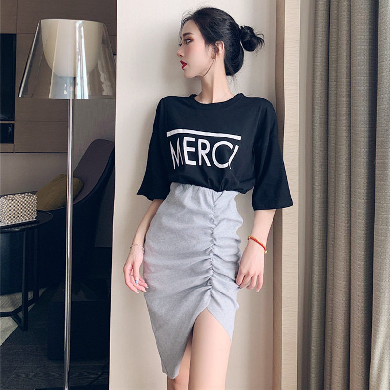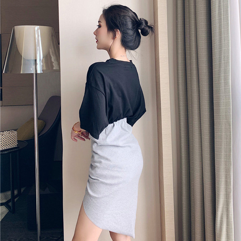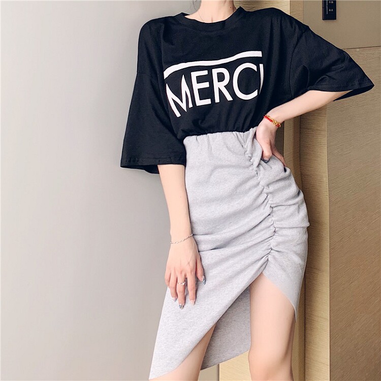 Black T-shirt grey half body dress white T-shirt black half body dress