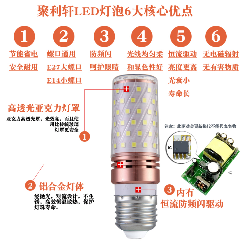 High-brightness LED bulb three-color dimming E27 large E14 small screw mouth 12W corn lamp candle bulb household energy-saving lighting