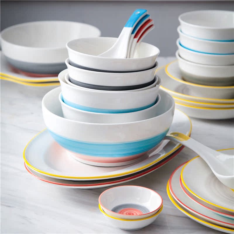Rainbow Yellow Gray Tattoo -5 - inch Bowl Rainbow Yellow Grey -6 - inch Bowl Rainbow Yellow Grey -7 - inch bowls Rainbow Yellow Grids-water glasses Rainbow Yellow Grids-Big soup Spoons Rainbow Red Blues -5