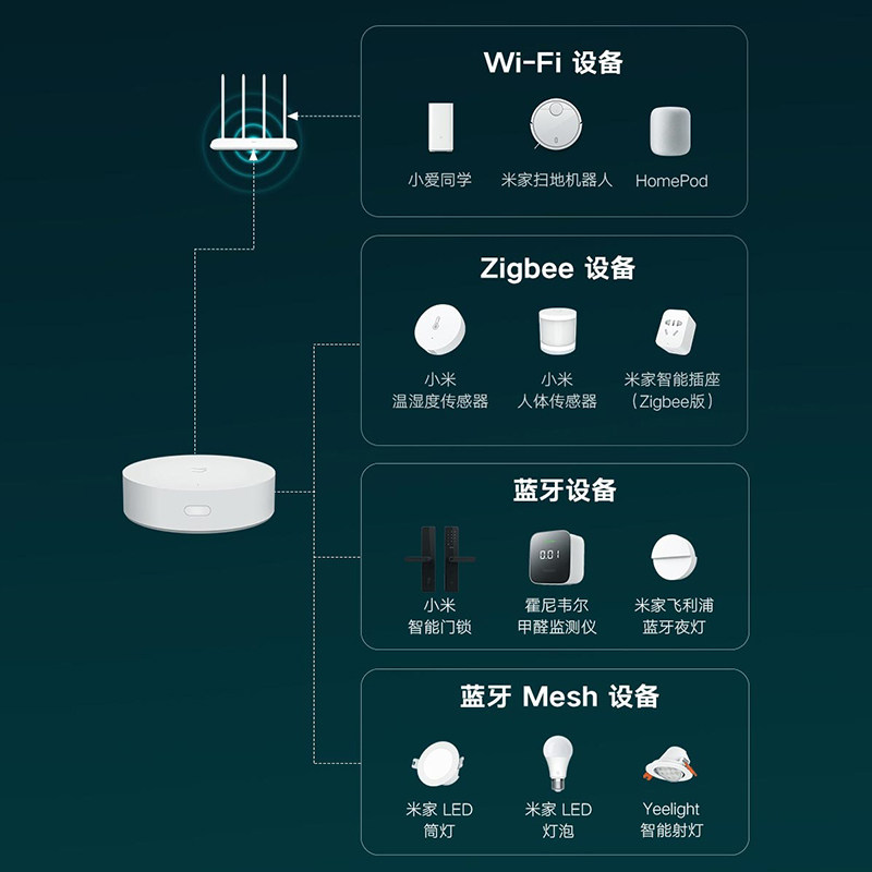 Xiaomi Multimode Gateway (Whole House Smart Hub) Human Sensor 2 (Used with Gateway) Mijia Wireless Switch (Used with Gateway) Door and Window Sensor 2 (Used with Gateway) Xiaomi Water Immersion