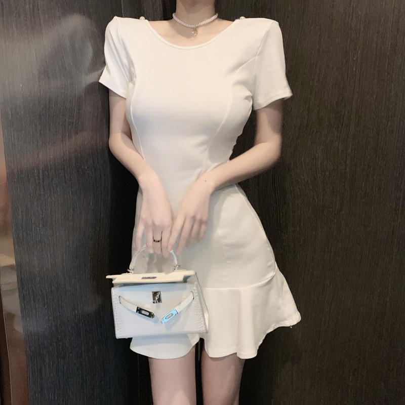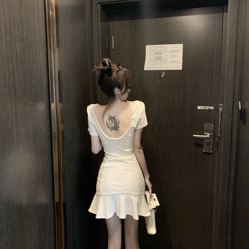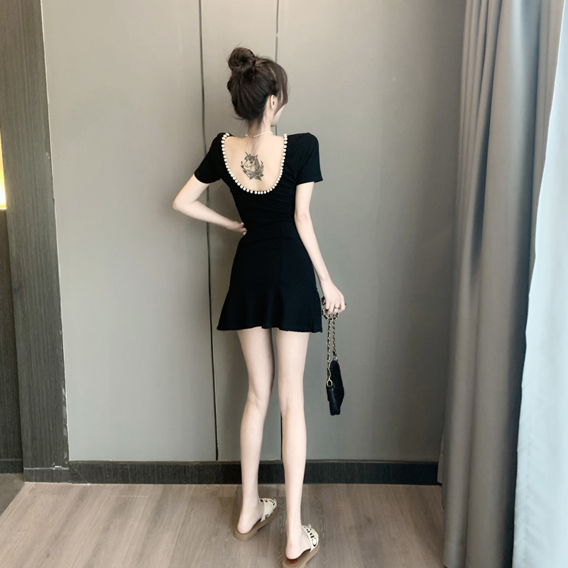 Summer new sexy careful machine big backless short-sleeved A-line skirt female retro niche waist slim dress