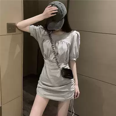 Summer new bubble sleeve side drawstring pleated bag arm skirt female Korean version of French slim slim Western dress