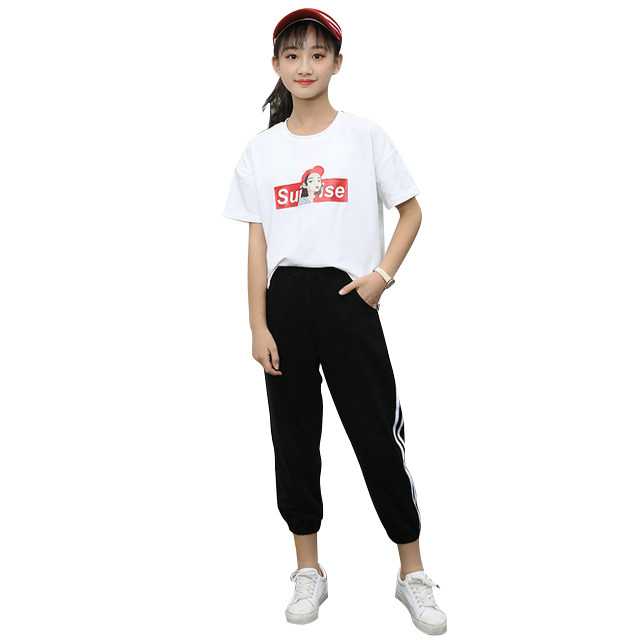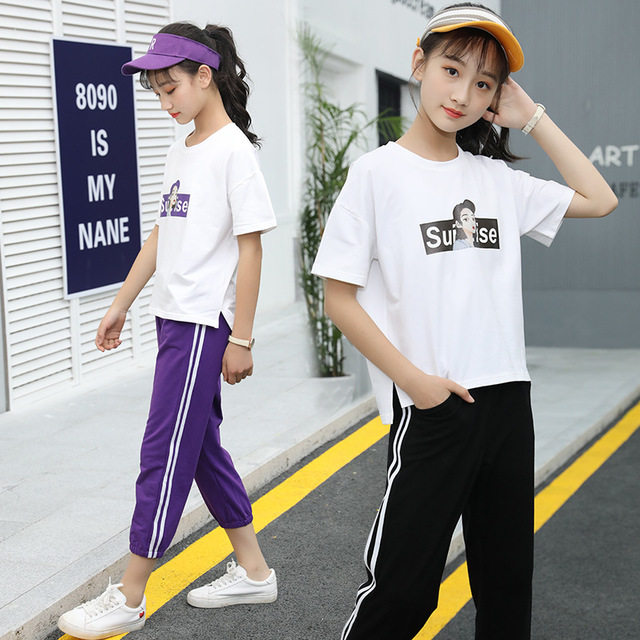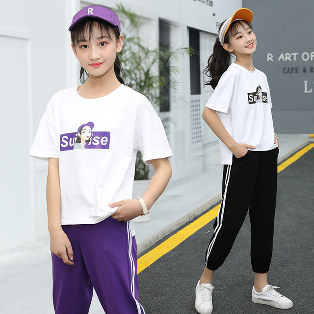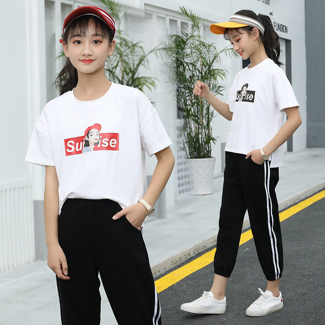 10 Girls short-sleeved suit 2020 summer new 15 children's cotton suit loose sports Western style two-piece suit 13