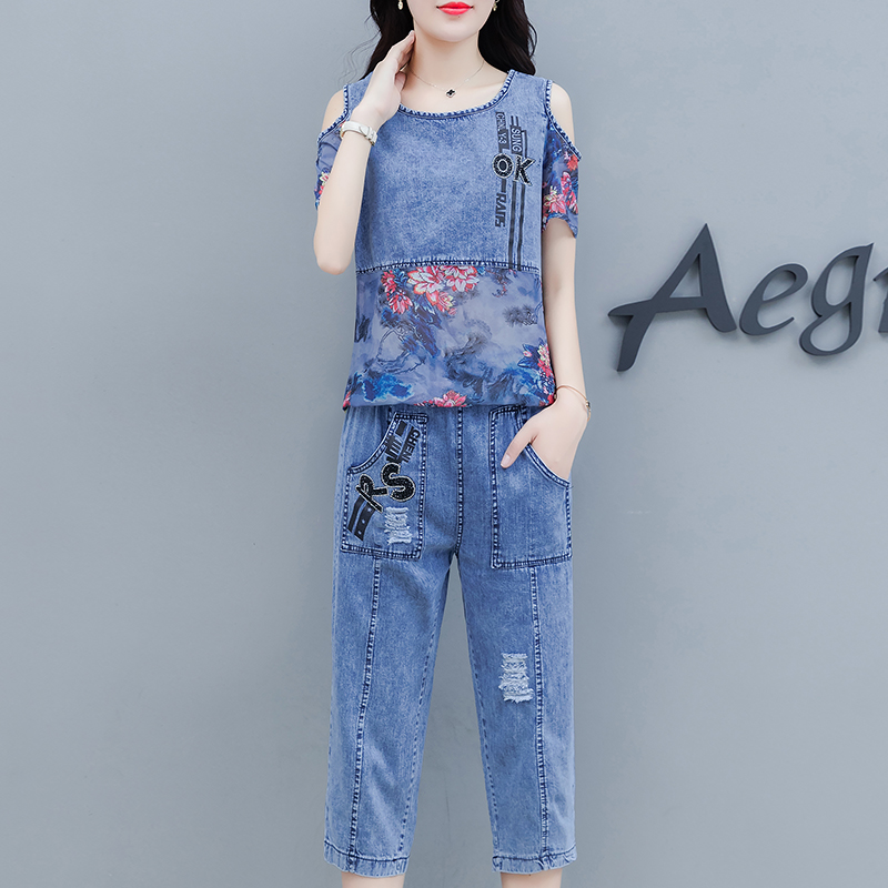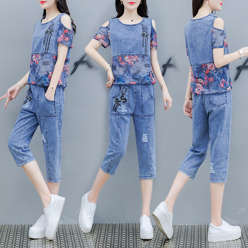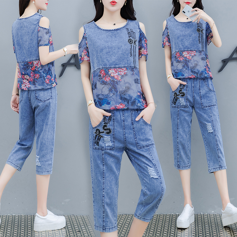 Large size 2022 summer cowboy with a pie suit female snowspin splice jeans and two sets of short sleeves seven pants