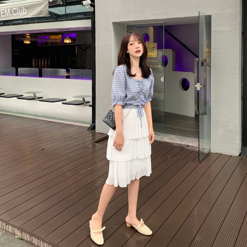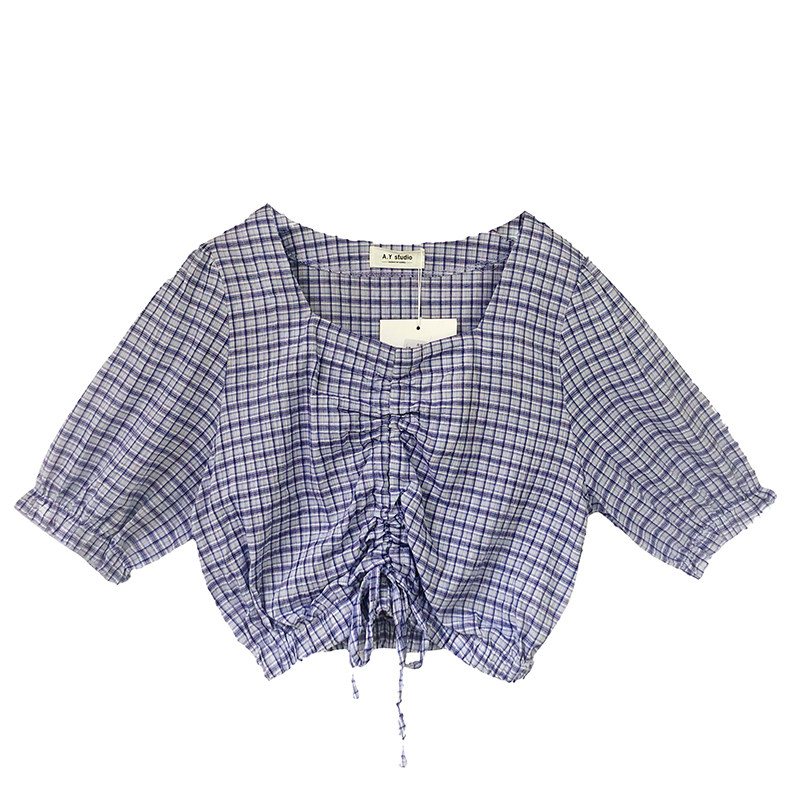 Clear cabin square collar blouses woman 2022 Summer fresh and sweet draw rope short Plaid Cotton Linen Shirt Bubble-Blister Sleeves
