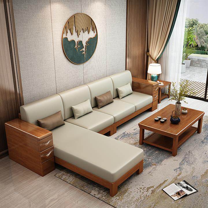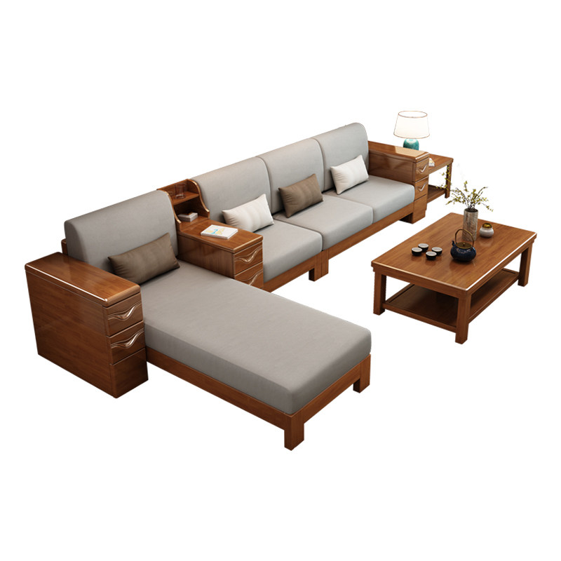 Solid wood fabric sofa combination modern minimalist new Chinese living room furniture corner size apartment storage sofa bed