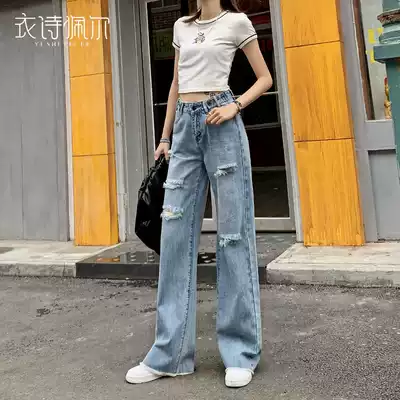 2021 new spring and autumn feeling hole high waist wide leg jeans women loose Thin Thin mop straight trousers
