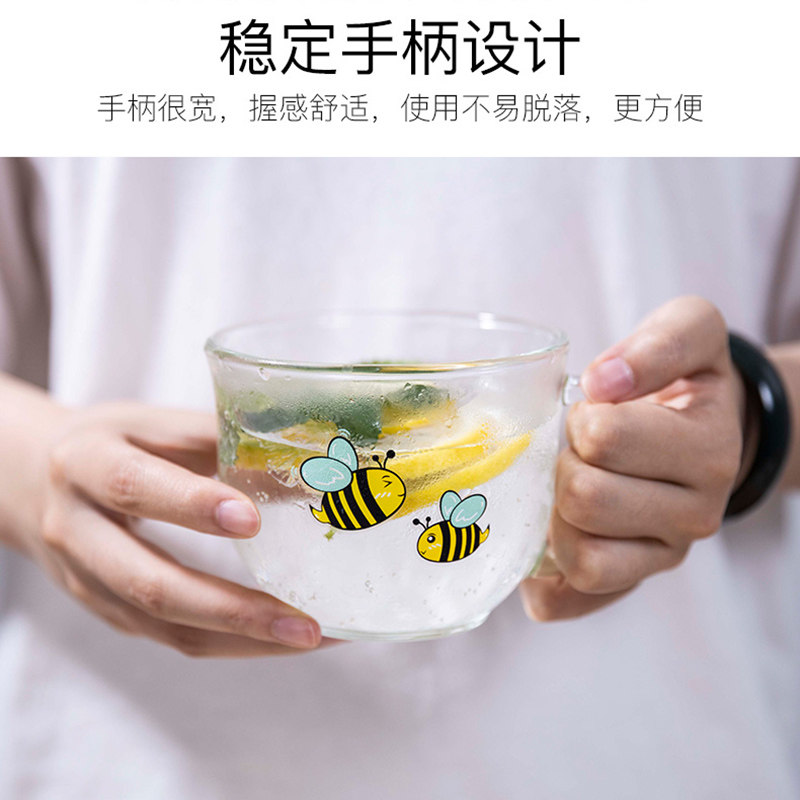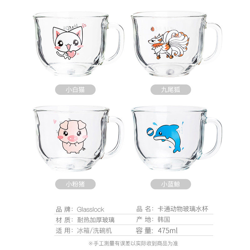 Glasslock Cartoon personality pattern handle thickened milk breakfast cup Household heat-resistant glass water cup
