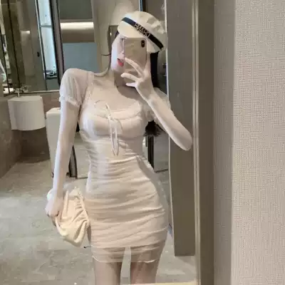 Sexy low-cut mesh bag hip skirt female summer 2021 new French retro fake two small fresh dresses