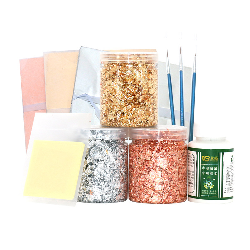 4.33cm pure gold foil 5 sheets of copper foil 14cm 100 sheets of copper foil 14cm 100 sheets of aluminum foil 14cm 100 sheets of broken bright gold leaf 10 grams of broken rose foil 10 grams of broken bright silver foil 10 grams of snowflake foil crushed 10g of broken red foil 8g of crushed dazzling yellow foil 8g of snowflake foil crushed 5g gold sprinkler (wool pen) water-based glue 100ML hook line pen 3 sticks