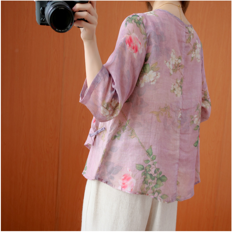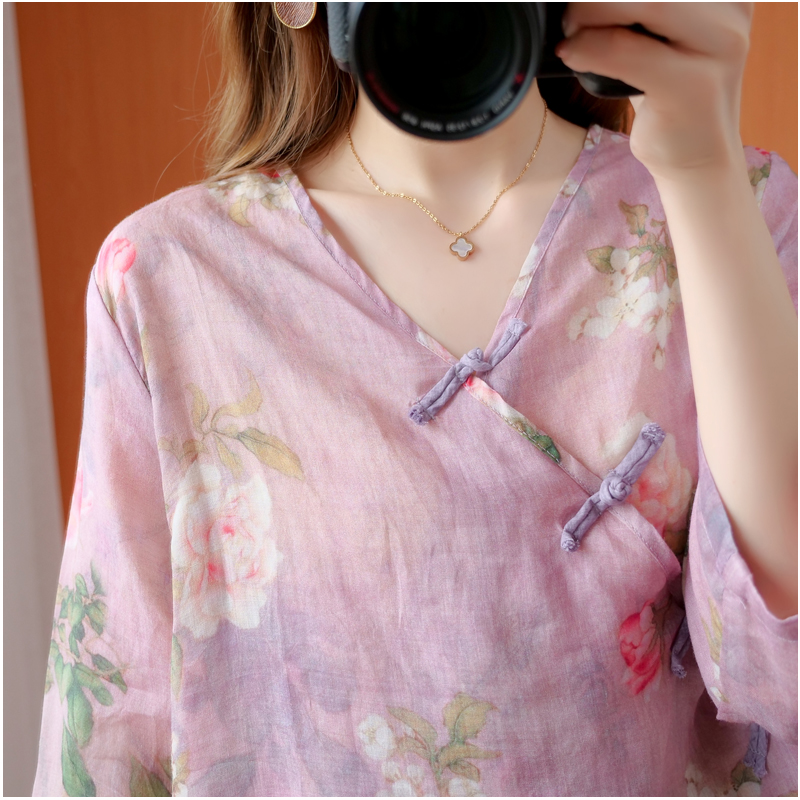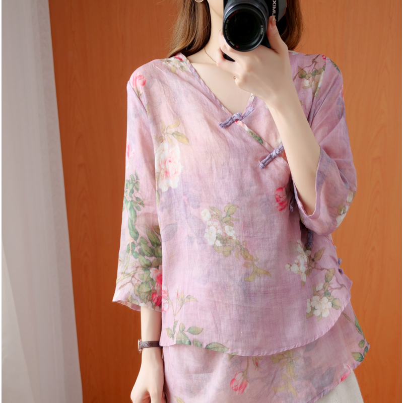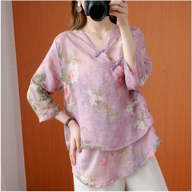 Retro Guofeng Hemp printed shirt women's V-neck sloping placket buckle literary linen loose cotton linen jacket summer thin