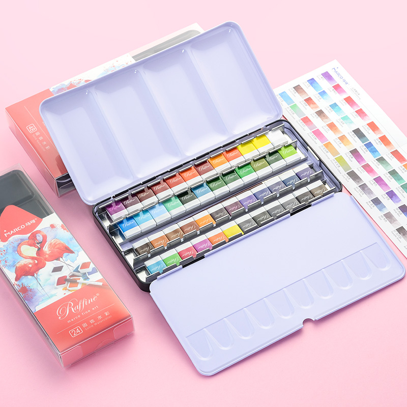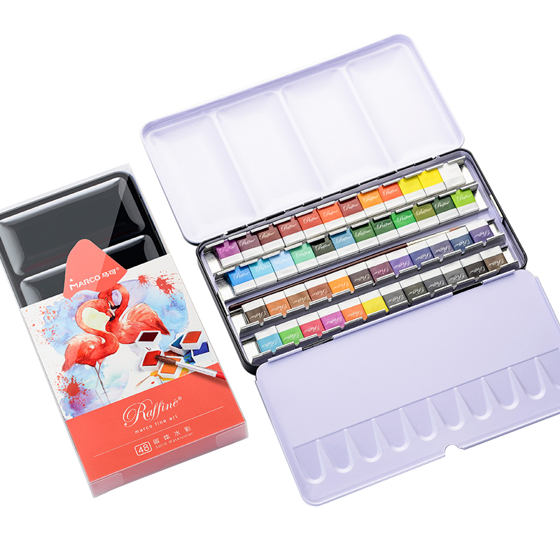 Marco Marco solid watercolor pigments 24 color 48 color students with fine art painted professional solid watercolor suit hand-painted paintbrush watercolor painting tool portable iron boxed with bespoke hair brush