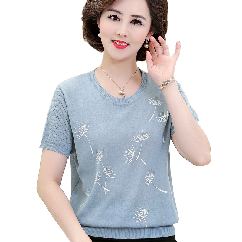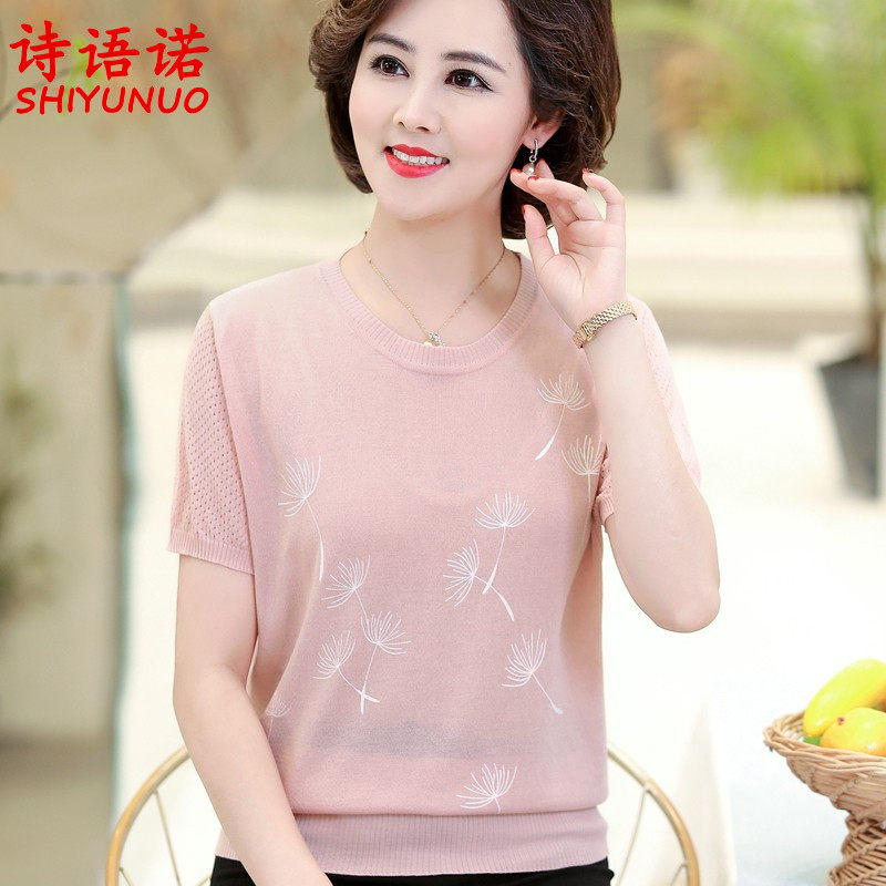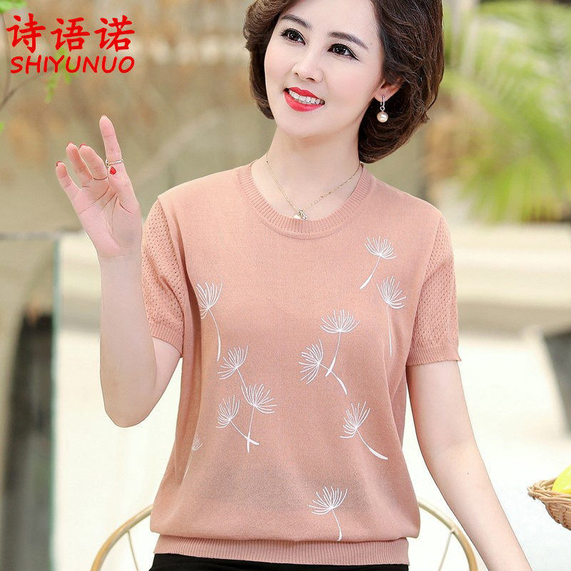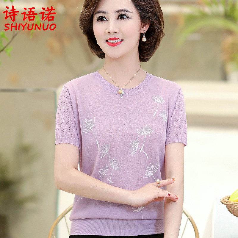 Middle Aged Women's Clothing Ice Silk Short Sleeve T-Shirt Summer Dress New Middle Aged Mother Dress Loose Large Size Knit Thin