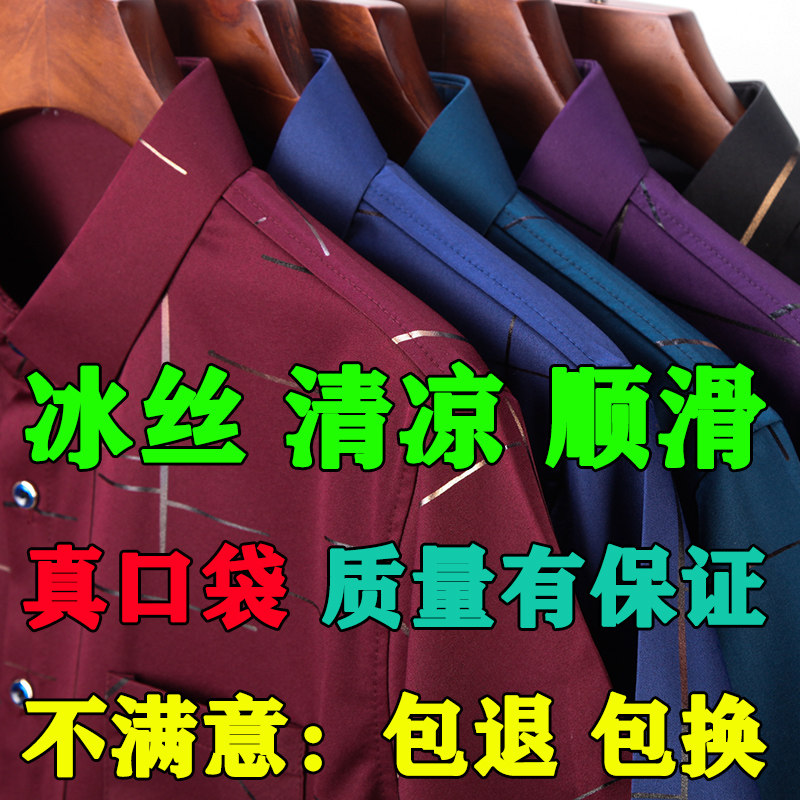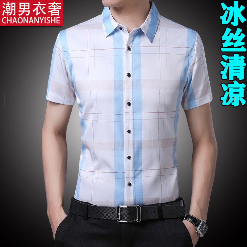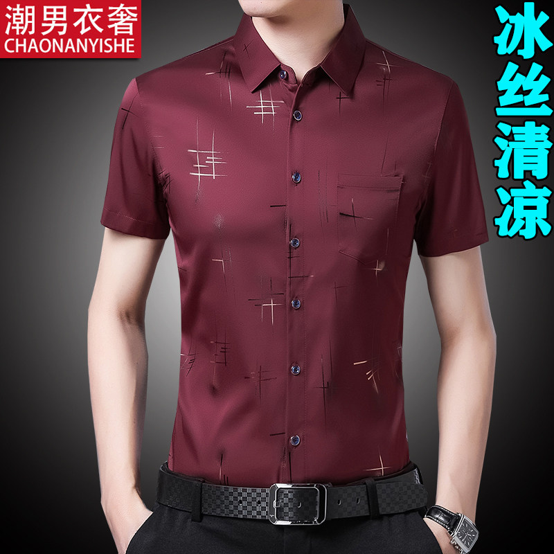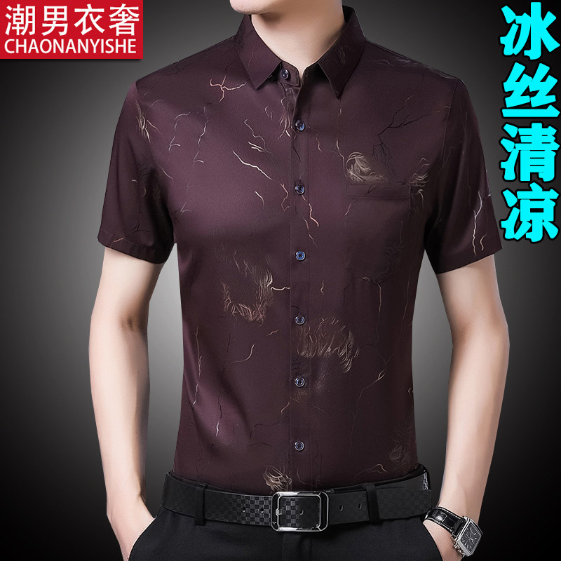 Middle-aged men's ice silk short sleeve shirt lapel collar with pockets cold and smooth non-trace inch shirt half sleeve dad summer clothes