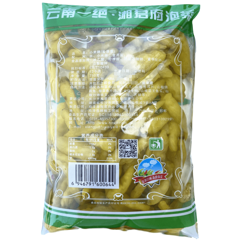 Xiangjunfu millet spicy FCL 750g*15 bags of Yunnan specialty wild mountain pepper pickled pepper chicken feet pickled fish head