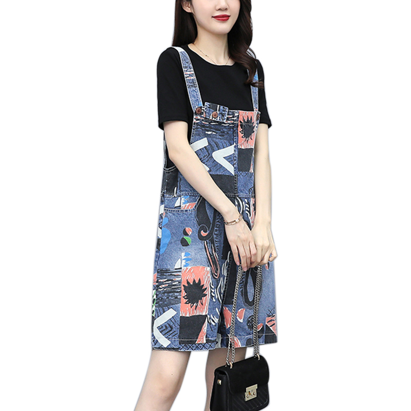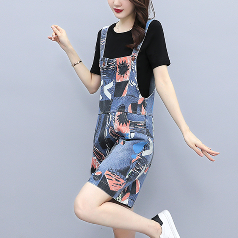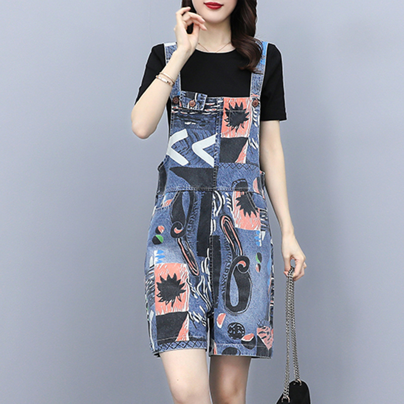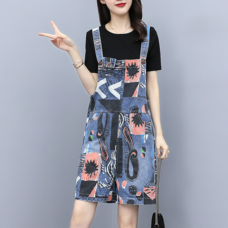 2022 Summer new large size Fat mm printed denim Baby Bag Pants Woman High Waist Harnesses Even Body Shorts Two-piece Style Suit