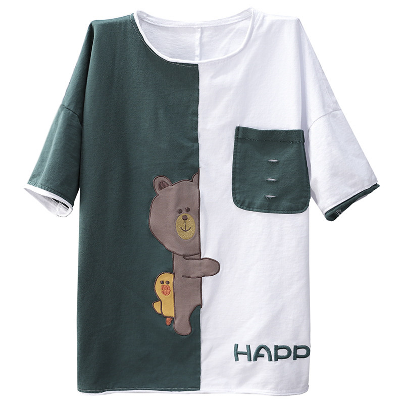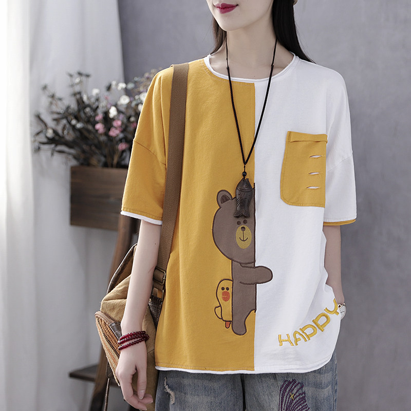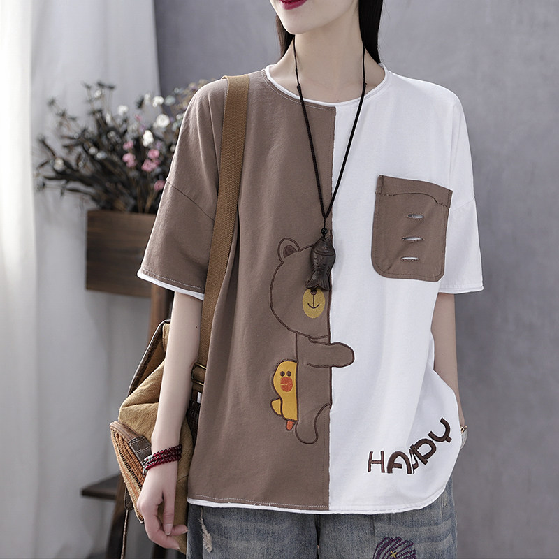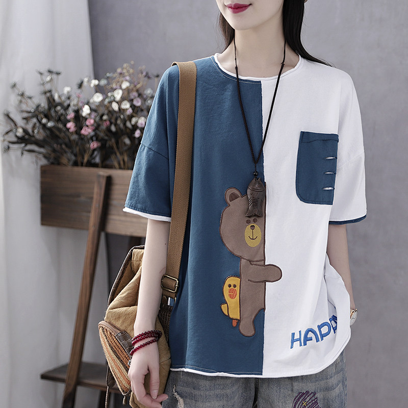 Han Suoyi retro literary spring and summer loose short-sleeved top lazy wind patch embroidery bear five-point sleeve t-shirt women