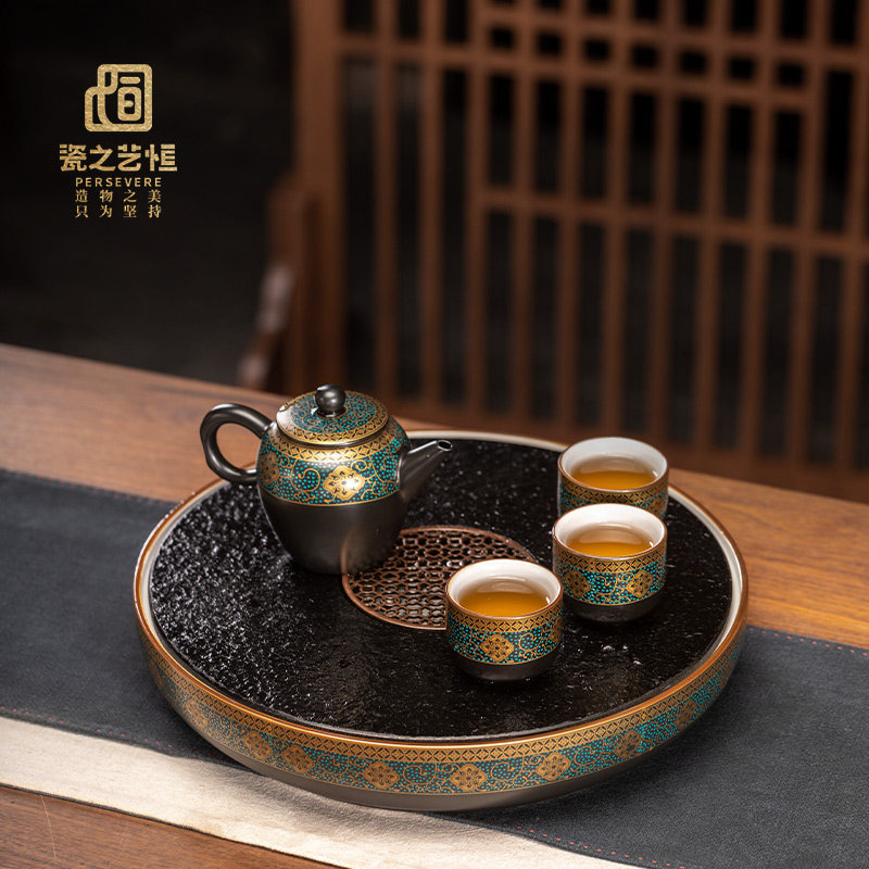 (456 disc stone surface) Tangled lotus automatic tea set - 15 heads + round tea tray stone surface large