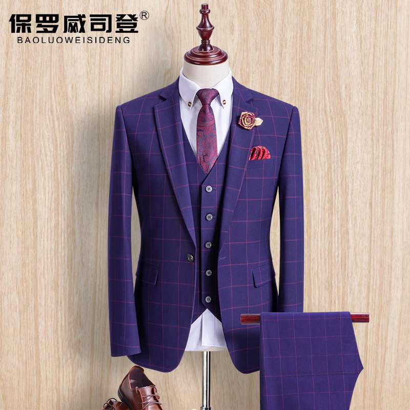Suit Suit Men's Korean Groom Wedding Dress Suit Dress Three-Piece English Style Plaid Slim Fit Spring and Summer