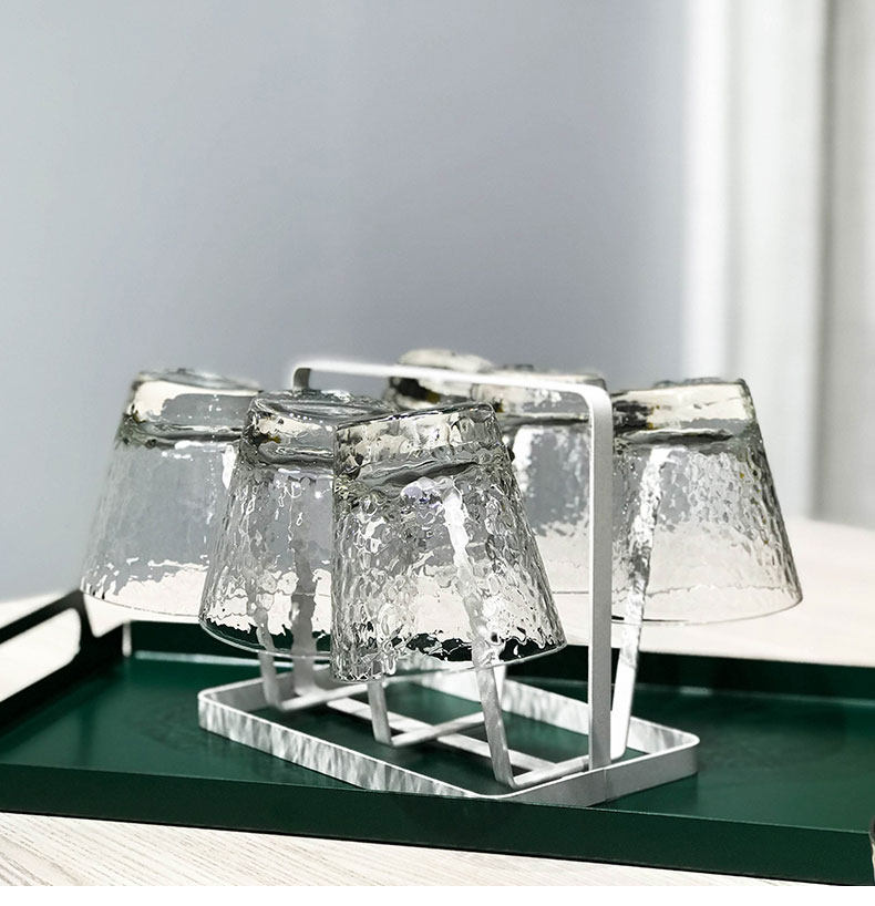 Six transparent short cups, four high amber cups, two clear high cups, six clear high cups, four short amber cups, two high amber cups, four clear high cups, six high amber cups, six clear short cups