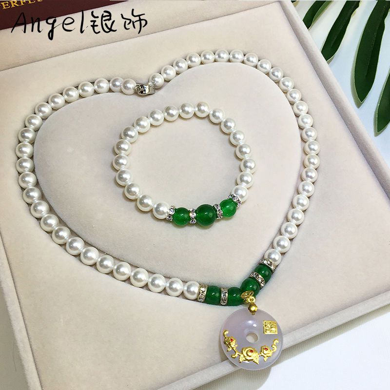 Pearl necklace jade medullary pendant gold inlaid with jade pearl necklace-flowers open rich and expensive