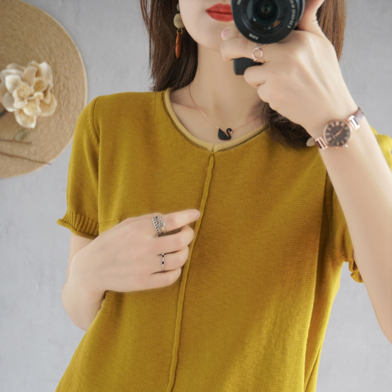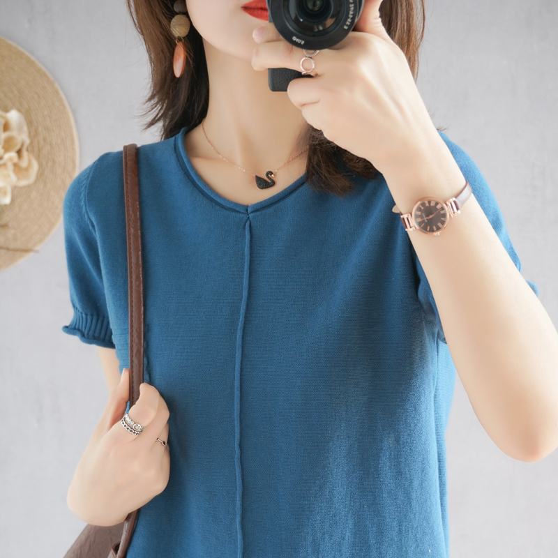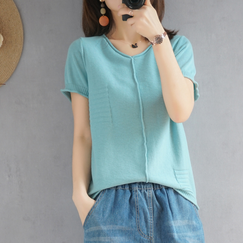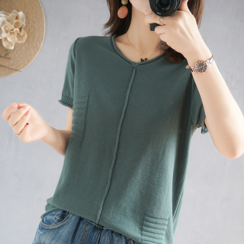 2021 new summer clothing cotton linen V collar knit short sleeve woman pure cotton T-shirt loose jacket casual Korean version linen half sleeve