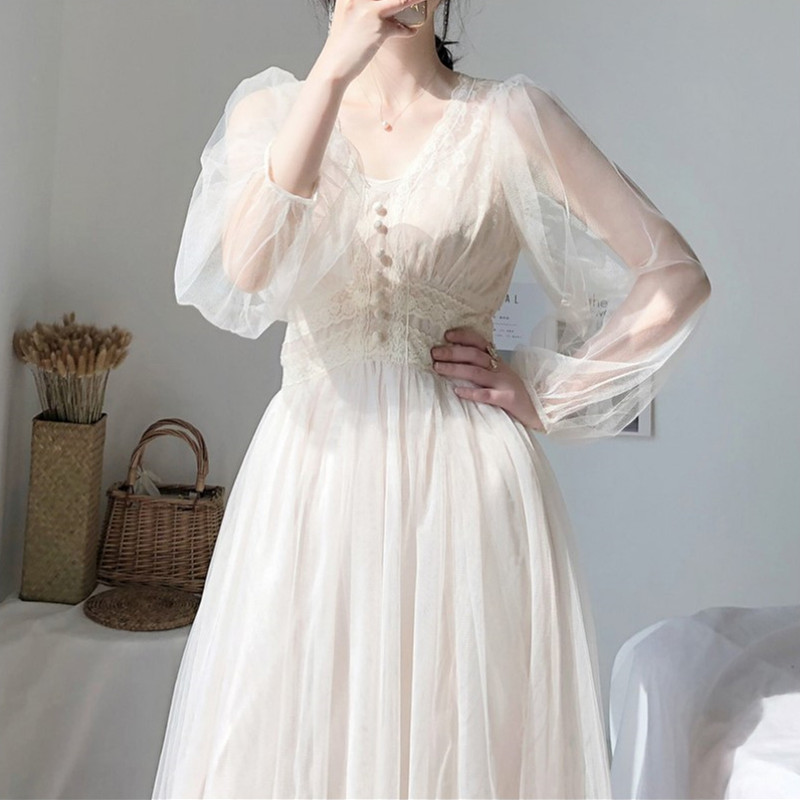 GROS SNIDEL Summer 2022 New lantern sleeves Supersenssenswarm net yarn Long dress Sexy lace dress