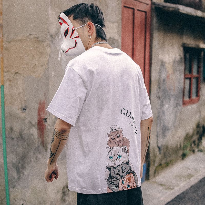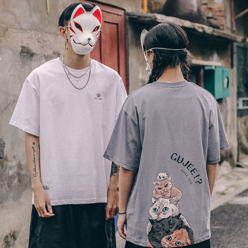 New Summer Cartoon Cat Printed T-shirts Men Casual Leisure Loose Couple Short-sleeved Line Breakthrough Han Edition