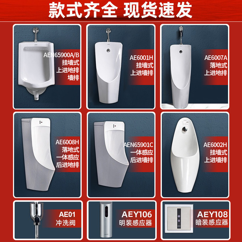 Ground Drainage AEN65900A (Upper Inlet Wall) Single Urinal Bucket Ground Drainage AEN65900A (Upper Inlet Wall-Mounted + AE01 Flushometer) Ground Drainage AEN65900A + Inductor AEY106 (DC) Open Installation Ground Drainage AEN65900A + Inductor AEY108 Series (DC) Concealed Ground Drainage AEN65900A + Inductor AEY108 Series (AC) Concealed Wall Drainage AEN65900B Upper Inlet Wall Hanging Wall (Single Urinal Bucket) Wall Drainage AEN65900B (Upper Water Hanging Wall Type + AE01 Flushometer) Wall Drainage AEN65900B + Inductor AEY106 (DC) Open Installation Wall Drainage AEN65900B + Inductor AEY108 Series (DC) Hidden Wall Drainage AEN65900B + Inductor AEY108 Series (AC) Hidden Wall Mounted AE6001H (Upper Inlet Wall Drainage) Wall-Mounted AE6001H+AE01 Flushometer Wall-Mounted AE6001H+ Inductor AEY106 (DC) Wall-mounted AE6001H + Inductor AEY108 Series (DC) Wall-Mounted AE6001H + Inductor AEY108 Series (AC) Floor-mounted AE6007A Upper Water Inlet Ground Drainage Floor-mounted AE6007A+AE007A+Inductor AEY106 (DC) Floor-Standing AE6007A+Inductor AEY108 Series (DC) Floor-Standing AE6007A+ Sensor AEY108 Series (AC)