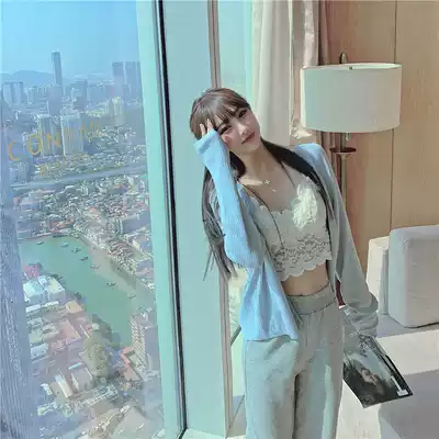 Lace suspender knitted cardigan high waist hanging straight trousers Hong Kong style fashion small three-piece suit female summer